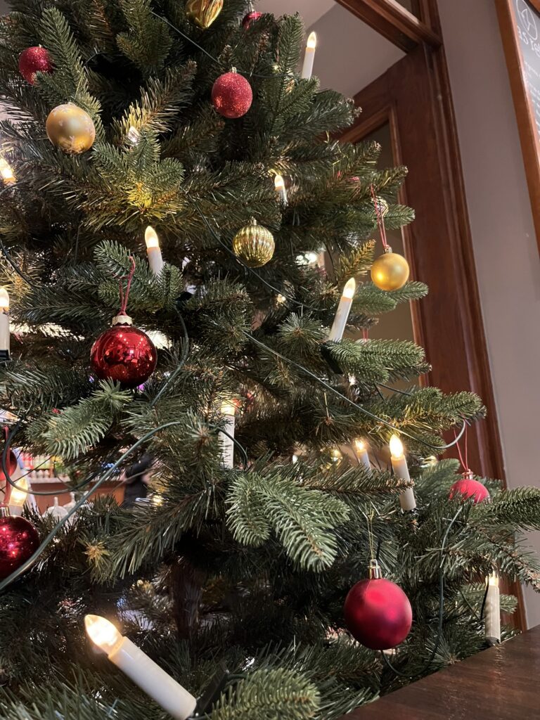 Ich sitze im Café, ein leckerer Capuccino steht vor mir. Mein Tisch ist direkt an einem geschmückten Weinachtsbaum. Der Platz gefällt mir!